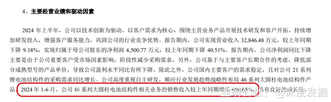 2024年1-6月,公司46系列大圆柱电池结构件的销售同比增长650.65%