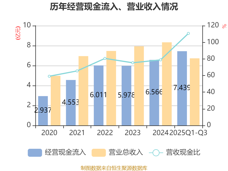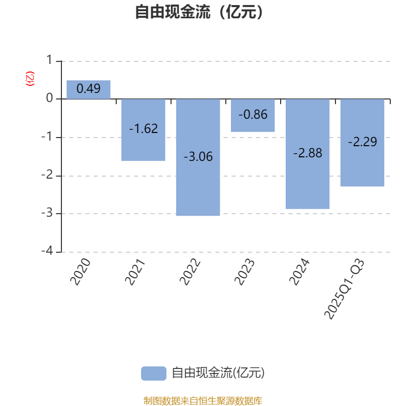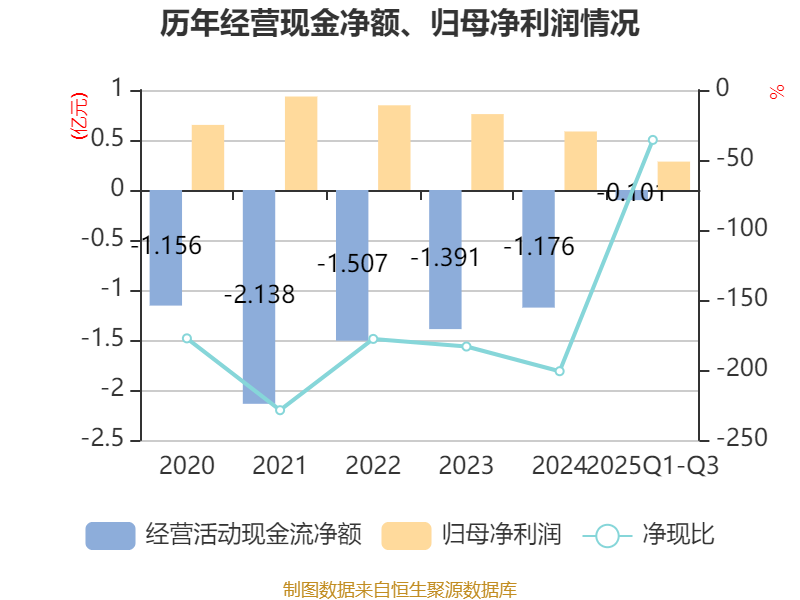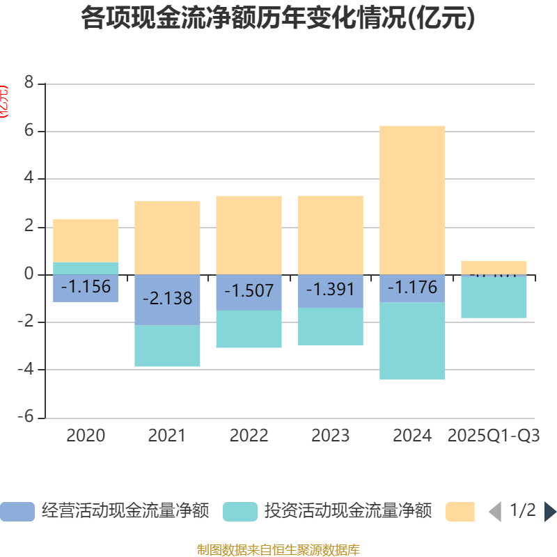 2025年前三季度,公司经营活动现金流净额为-1012.62万元,同比增加6669.28万元;筹资活动现金流净额5629.87万元,同比减少4.4亿元;投资活动现金流净额-1.72亿元,上年同期为-2.05亿元。