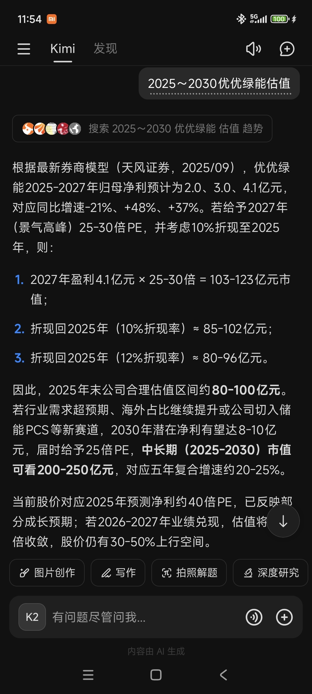 2025~2030年,未来五年若业绩能兑现,优优绿能估值可达200~250亿市值。