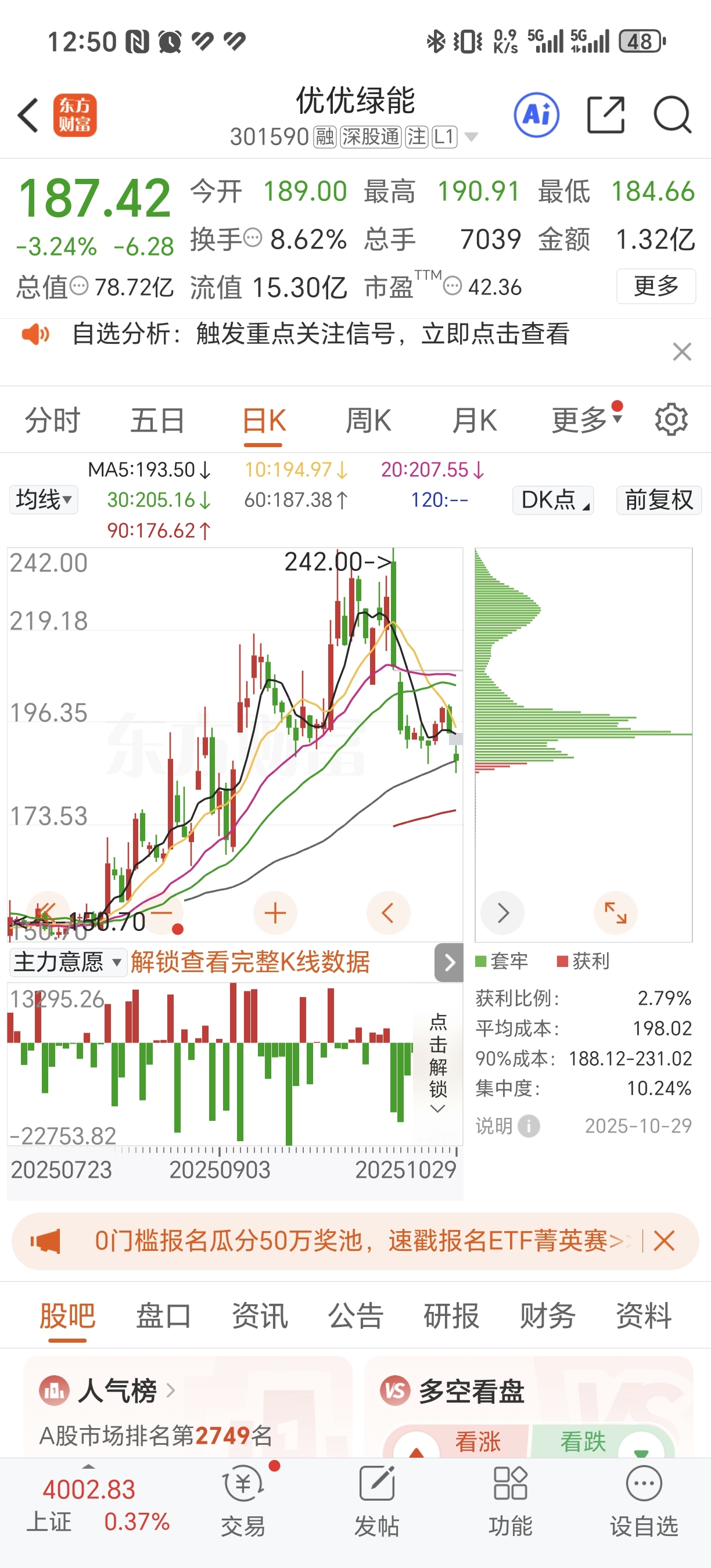 $优优绿能(SZ301590)$ 97%的套牢盘了!优优的韭菜们