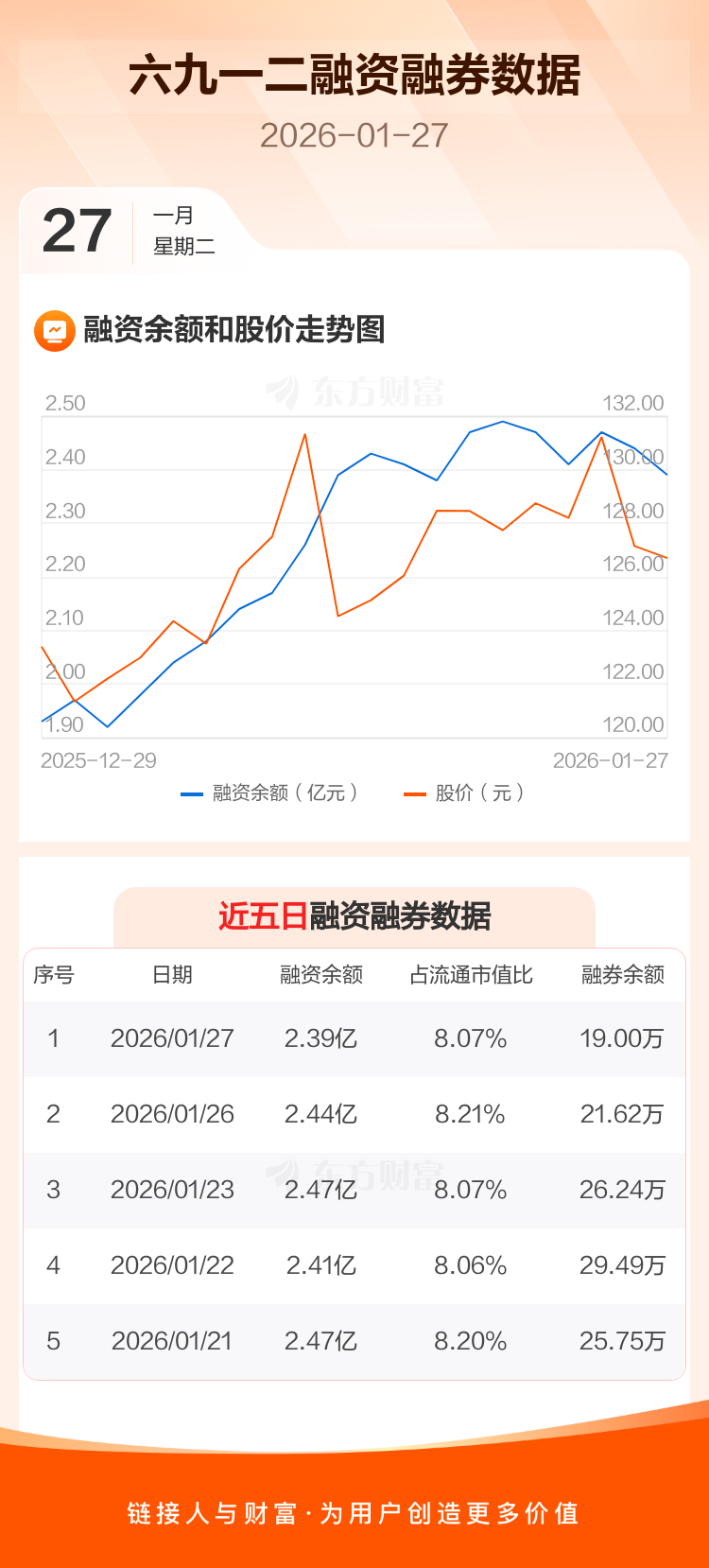 交易所最新数据显示,六九一二于2026年1月27日获融资买入1128.49万元,融资偿还1631.99万元,当日融资净偿还503.5万元。目前,该股融资余额2.39亿,占流通市值比例为8.07%。