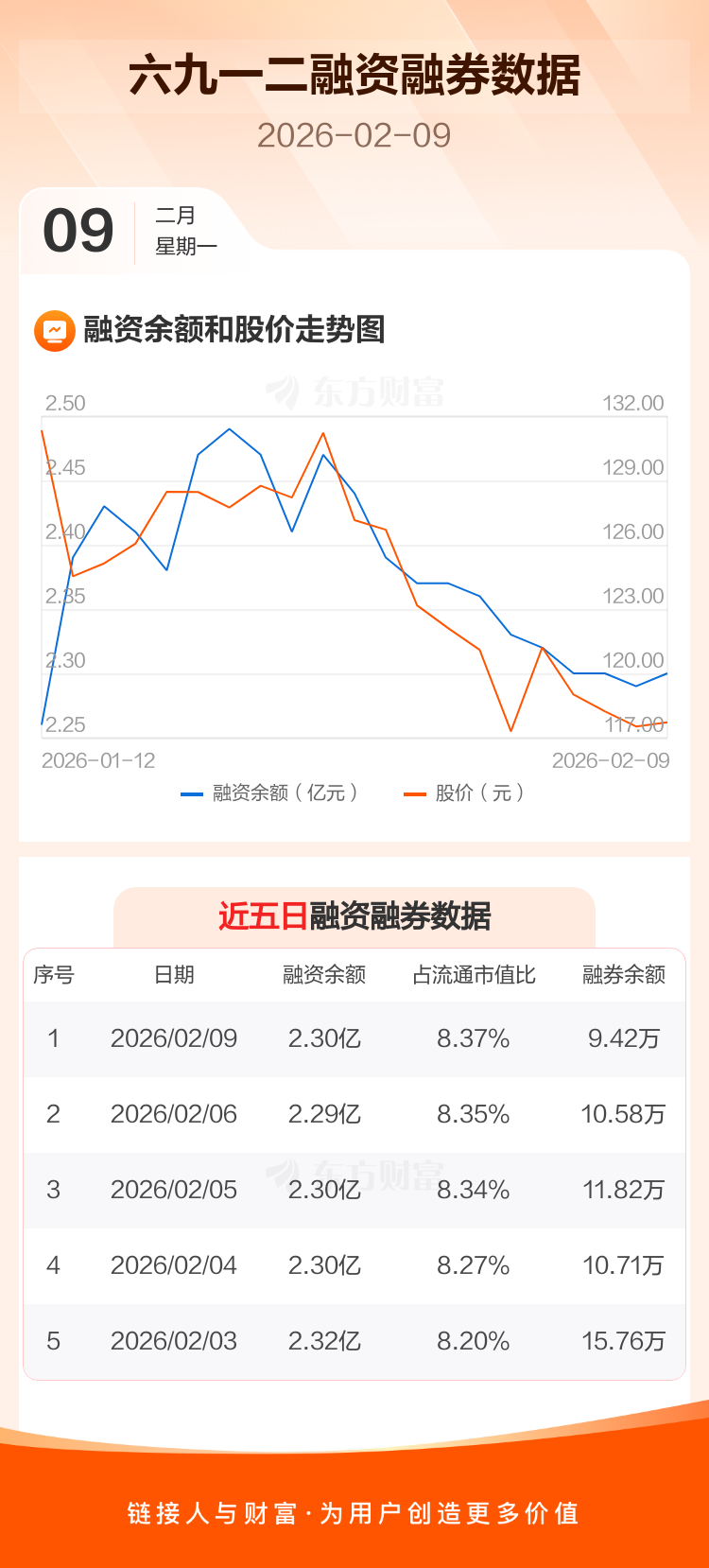 交易所最新数据显示,六九一二于2026年2月9日获融资买入585.58万元,融资偿还502.87万元,当日融资净买入82.71万元。目前,该股融资余额2.30亿,占流通市值比例为8.37%。