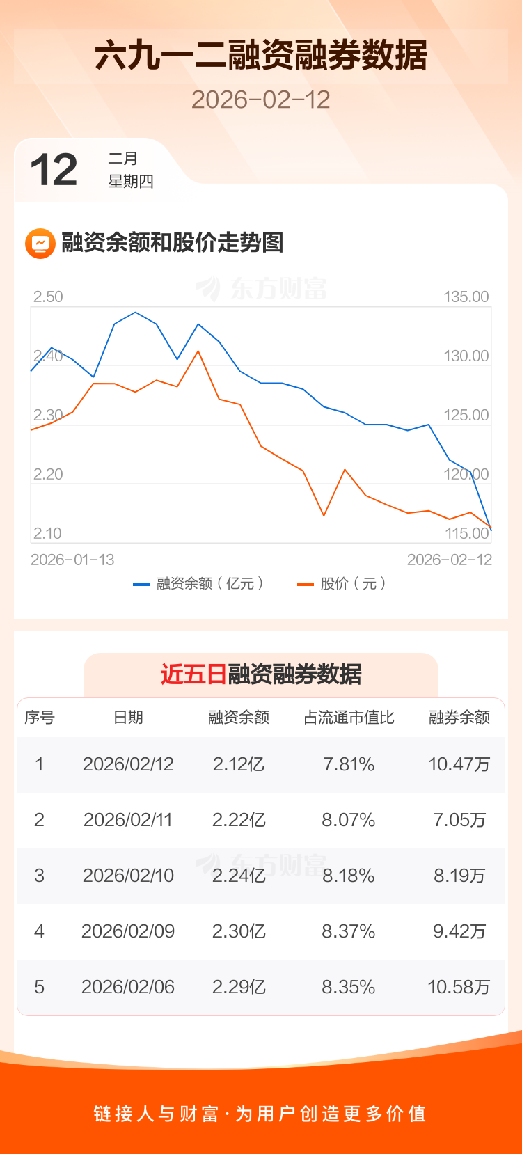 交易所最新数据显示,六九一二于2026年2月12日获融资买入458.21万元,融资偿还1420.79万元,当日融资净偿还962.59万元。目前,该股融资余额2.12亿,占流通市值比例为7.81%。