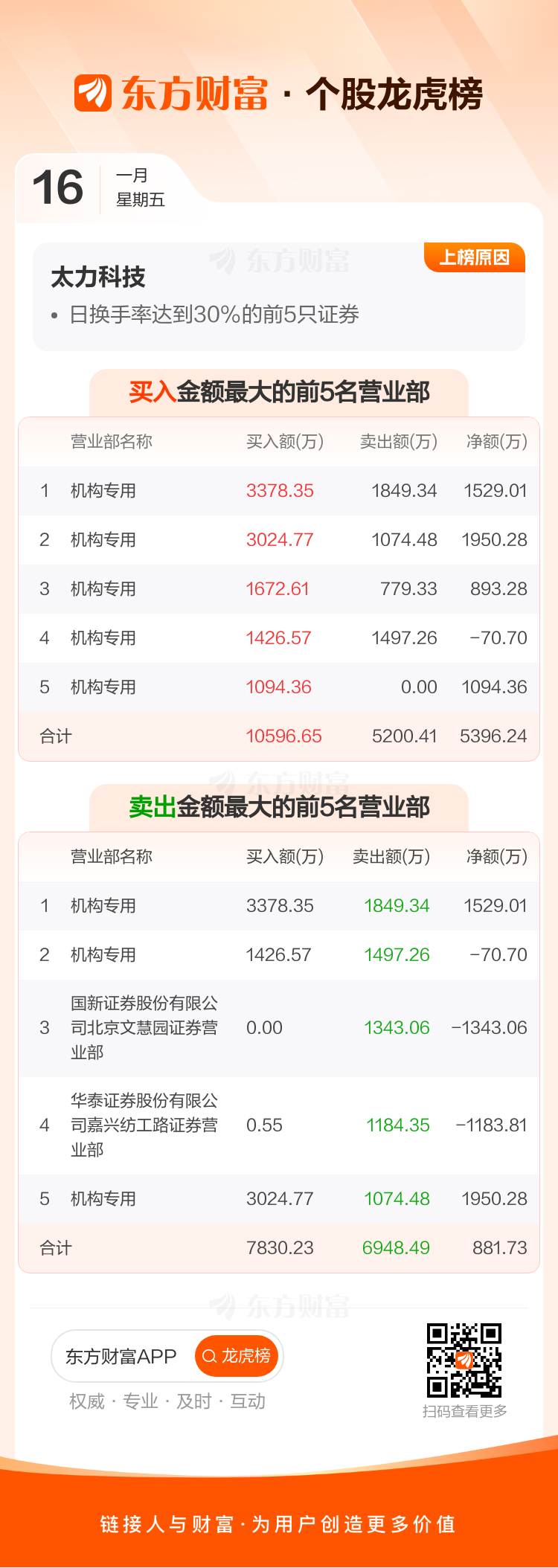 交易所2026年1月16日公布的交易公开信息显示,太力科技因成为日换手率达到30%的前5只证券上榜。太力科技当日收报53.55元,涨跌幅10.53%,偏离值35.60%,换手率35.60%,成交额4.58亿。