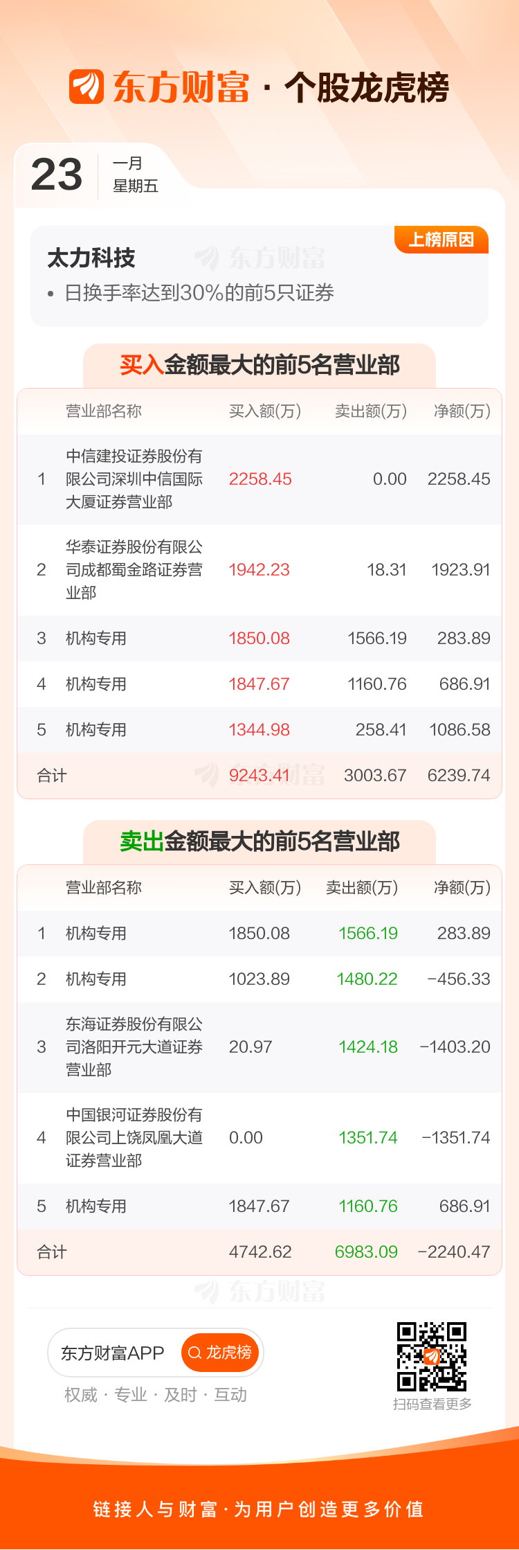 交易所2026年1月23日公布的交易公开信息显示,太力科技因成为日换手率达到30%的前5只证券上榜。太力科技当日收报62.08元,涨跌幅12.08%,偏离值36.35%,换手率36.35%,成交额5.47亿。