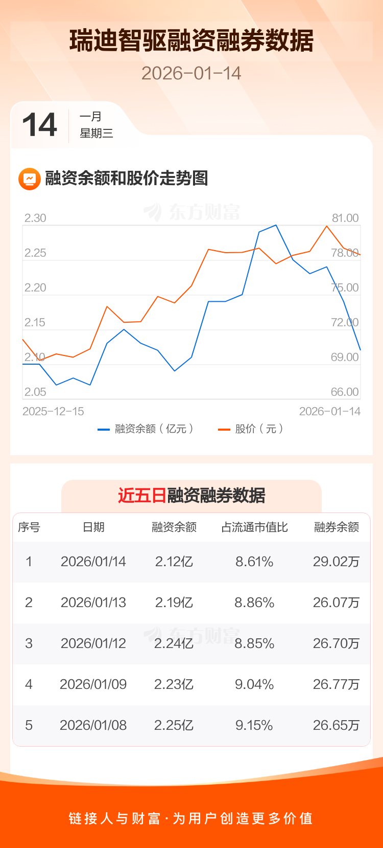交易所最新数据显示,瑞迪智驱于2026年1月14日获融资买入1416.06万元,融资偿还2193.36万元,当日融资净偿还777.3万元。目前,该股融资余额2.12亿,占流通市值比例为8.61%。
