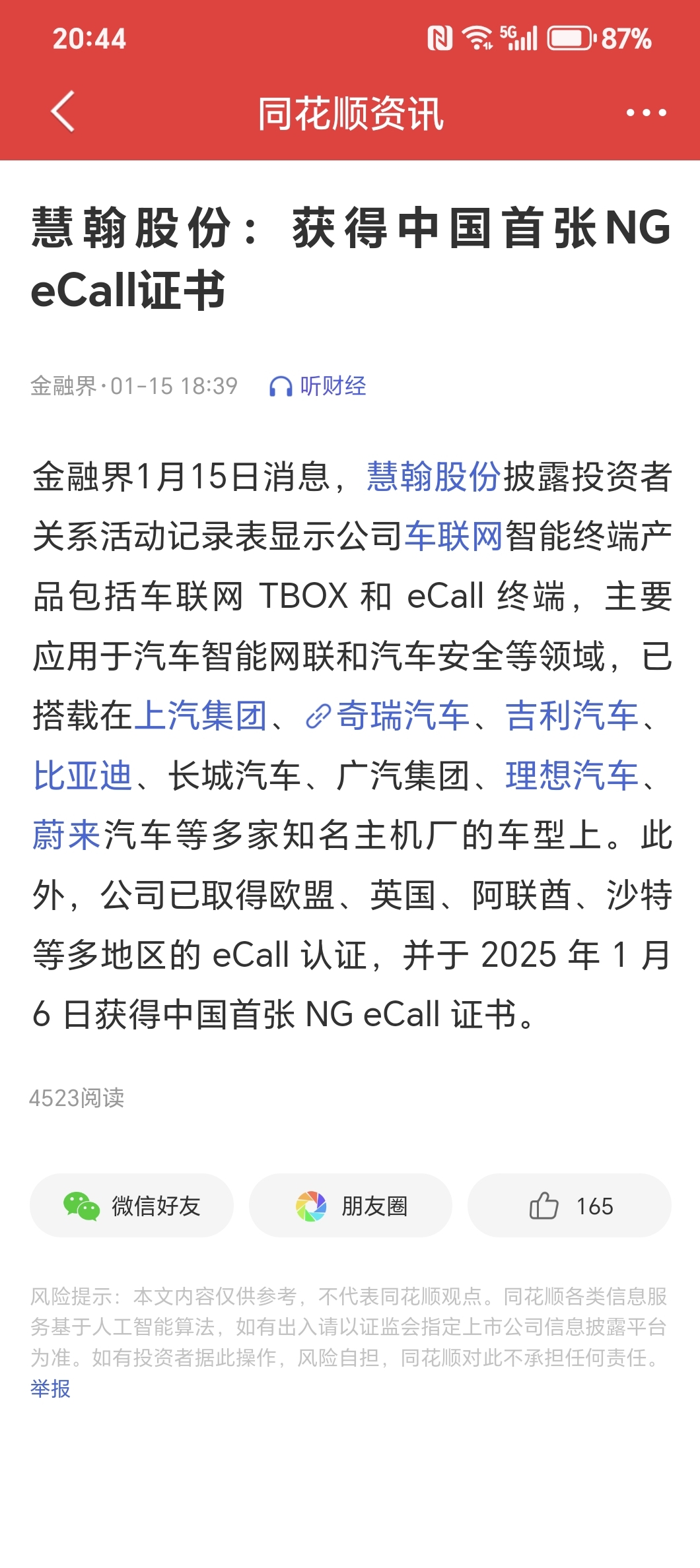 $慧翰股份(SZ301600)$ 先把资质给你,后面政策实行,非你莫属。强制安装Ecall就快执行了。个人猜想。