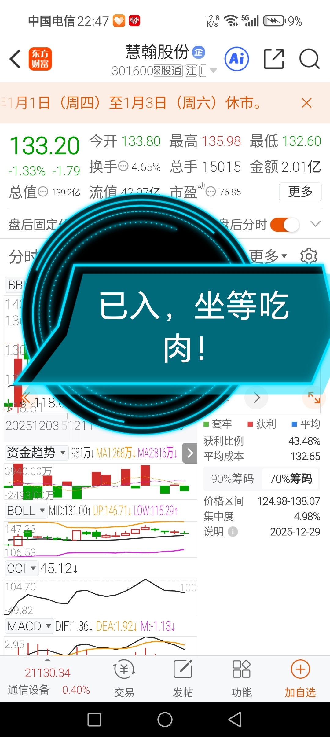 $慧翰股份(SZ301600)$ 今己入,看看明天能不能上涨!
