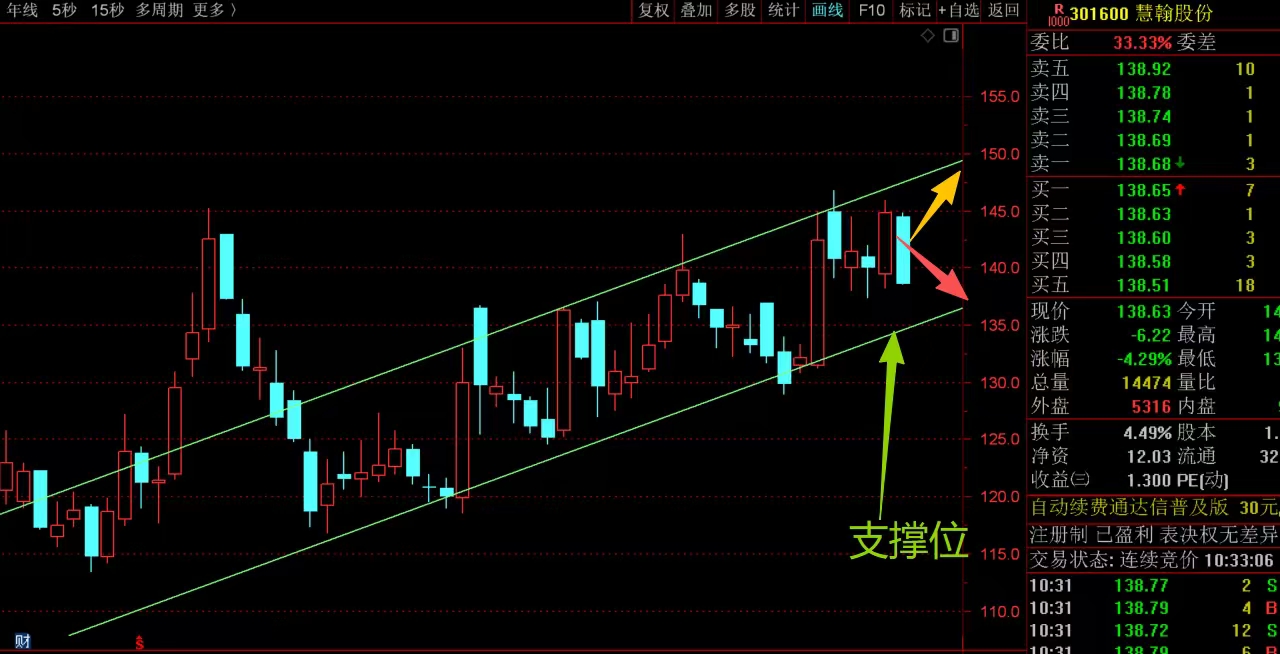 $慧翰股份(SZ301600)$ 中期趋势还算稳健,近期反弹主要是沿着一个通道进行盘整向上,短线来看,重点是观察能否后续沿着通道继续震荡拉升,能就没问题,如果不能就要注意脚底趋势线的支撑情况,能稳住就好说,有效跌破就要注意短线的回落风险了,需要控制仓位应对。#强势机会# #复盘记录#