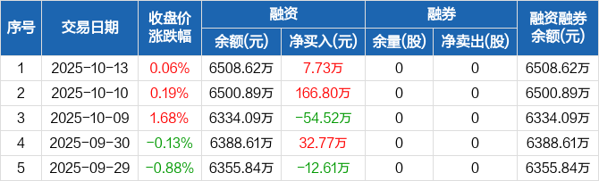 惠通科技:融资净买入7.73万元,融资余额6508.62万元(10-13)