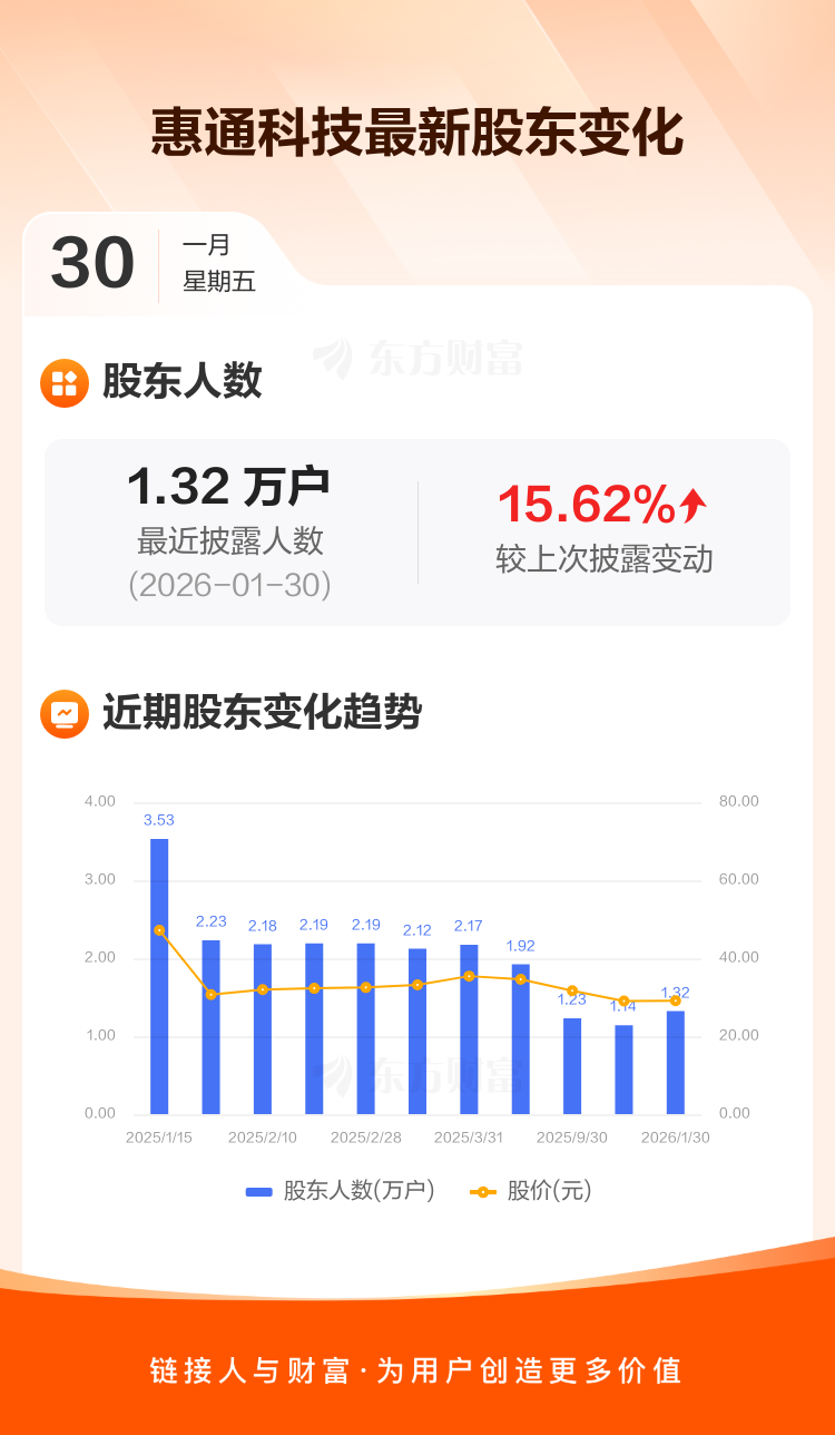 惠通科技:截至1月30日最新股东户数1.32万户,较上期增加15.62%