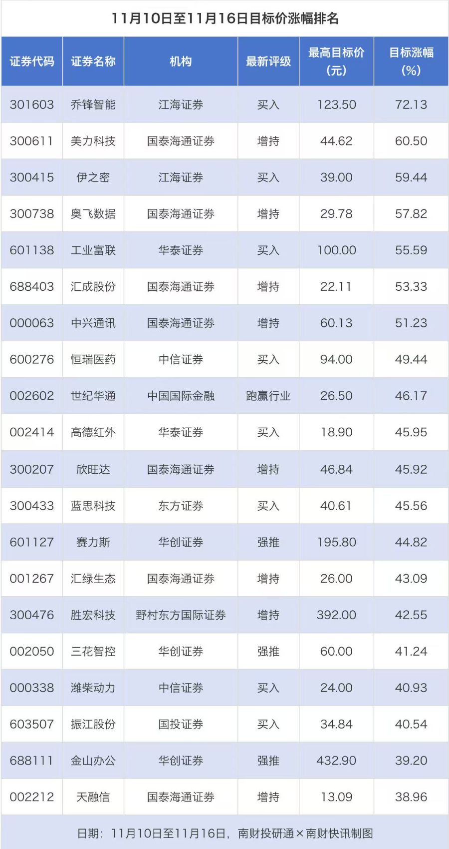 南财投研通数据显示,11月10日至11月16日,券商给予上市公司目标价共127次,按最新收盘价计算,目标价涨幅排名居前的公司有乔锋智能、美力科技、伊之密,目标价涨幅分别为72.13%、60.50%、59.44%,分别属于通用设备、汽车零部件、专用设备行业。