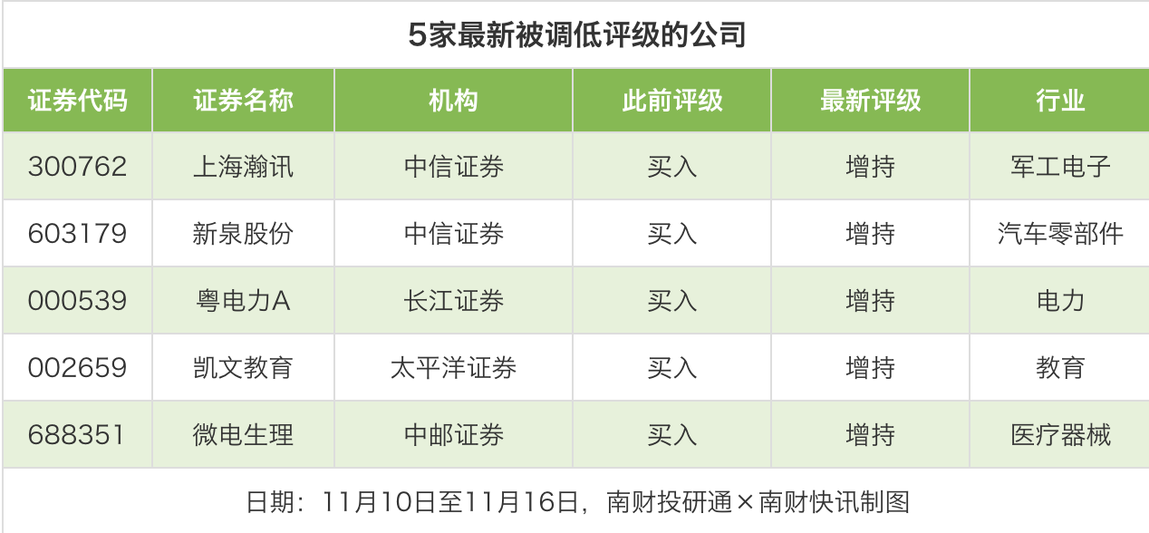评级调低方面,11月10日至11月16日,券商调低上市公司评级达到5家次,最新数据包括了中信证券对上海瀚讯的评级从“买入”调低至“增持”,中信证券对新泉股份的评级从“买入”调低至“增持”,长江证券对粤电力A的评级从“买入”调低至“增持”。
