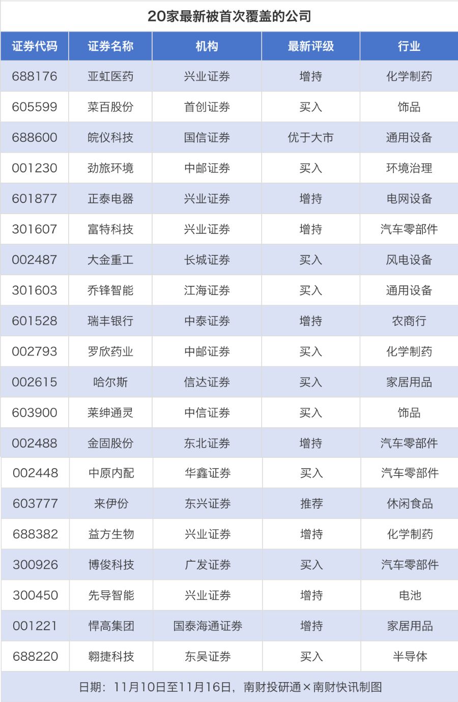 首次覆盖方面,11月10日至11月16日券商共给出了91次首次覆盖,其中亚虹医药、正泰电器获得兴业证券分别给予“增持”“增持”评级,菜百股份获得首创证券给予“买入”评级,皖仪科技获得国信证券给予“优于大市”评级,劲旅环境获得中邮证券给予“买入”评级。