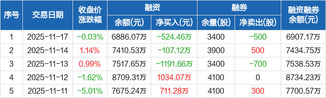 融资方面,当日融资买入480.97万元,融资偿还1005.43万元,融资净偿还524.46万元,连续3日净偿还累计1823.24万元。融券方面,融券卖出0股,融券偿还500股,融券余量3400股,融券余额21.11万元。融资融券余额合计6907.17万元。