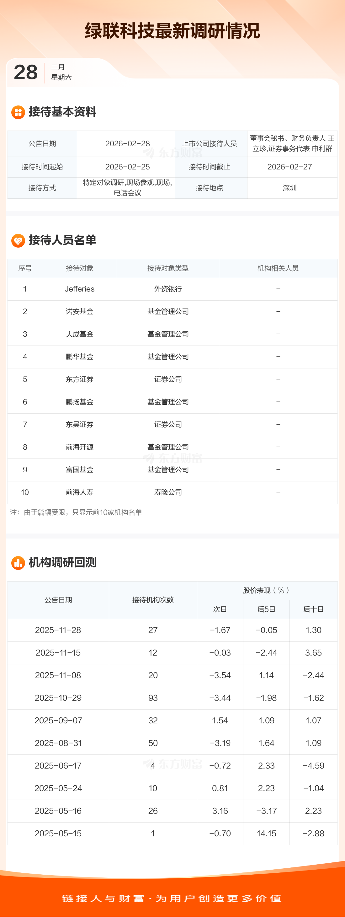 绿联科技2月28日公告称,2月25日至2月27日接待Jefferies等48家机构调研。接待人员包括董事会秘书、财务负责人 王立珍,证券事务代表 申利群。