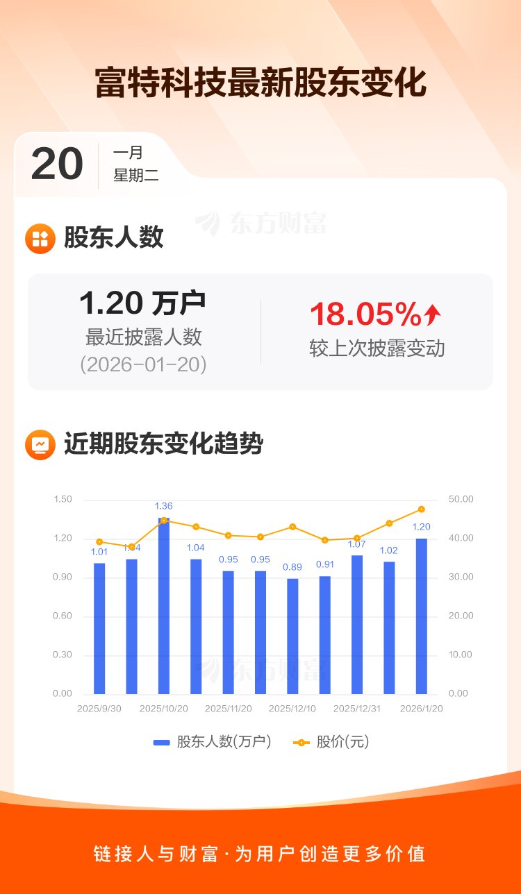富特科技最新披露数据显示,截至1月20日公司股东户数为1.20万户,较上期(2026年1月9日)增加1842户,增幅为18.05%。户均持有流通股数量由上期的1.10万股下降至9285股,户均持股金额由上期的48.16万元减少至44.16万元。