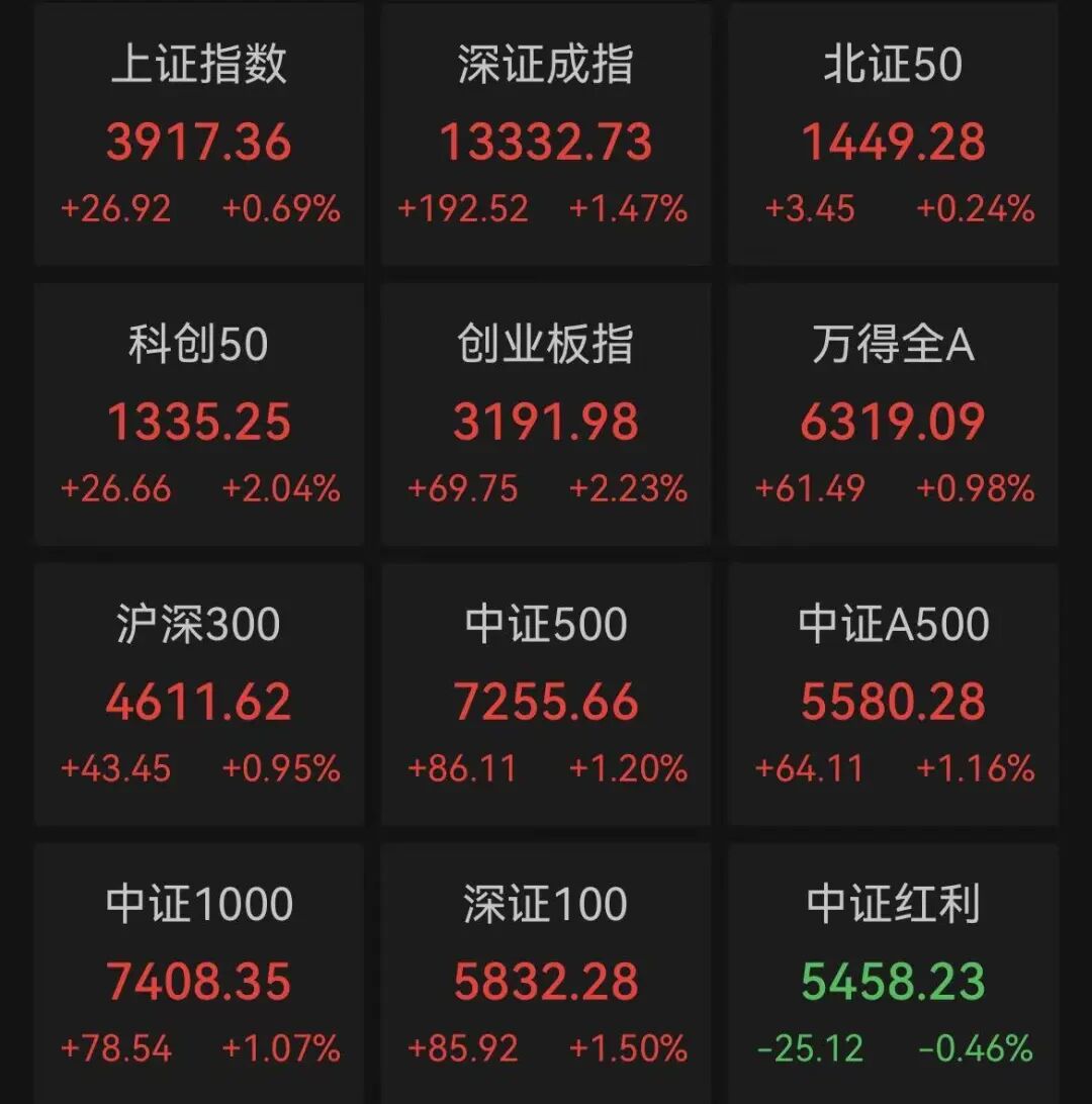 具体来看,两市主要股指盘中强势上扬,创业板指、科创50指数大涨超2%。截至收盘,沪指涨0.69%报3917.36点,深证成指涨1.47%,创业板指涨2.23%,科创50指数涨2.04%,沪深北三市合计成交18825亿元,较此前一日增加1336亿元。
