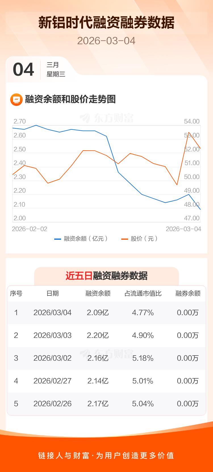 交易所最新数据显示,新铝时代于2026年3月4日获融资买入2683.29万元,融资偿还3752.02万元,当日融资净偿还1068.73万元。目前,该股融资余额2.09亿,占流通市值比例为4.77%。