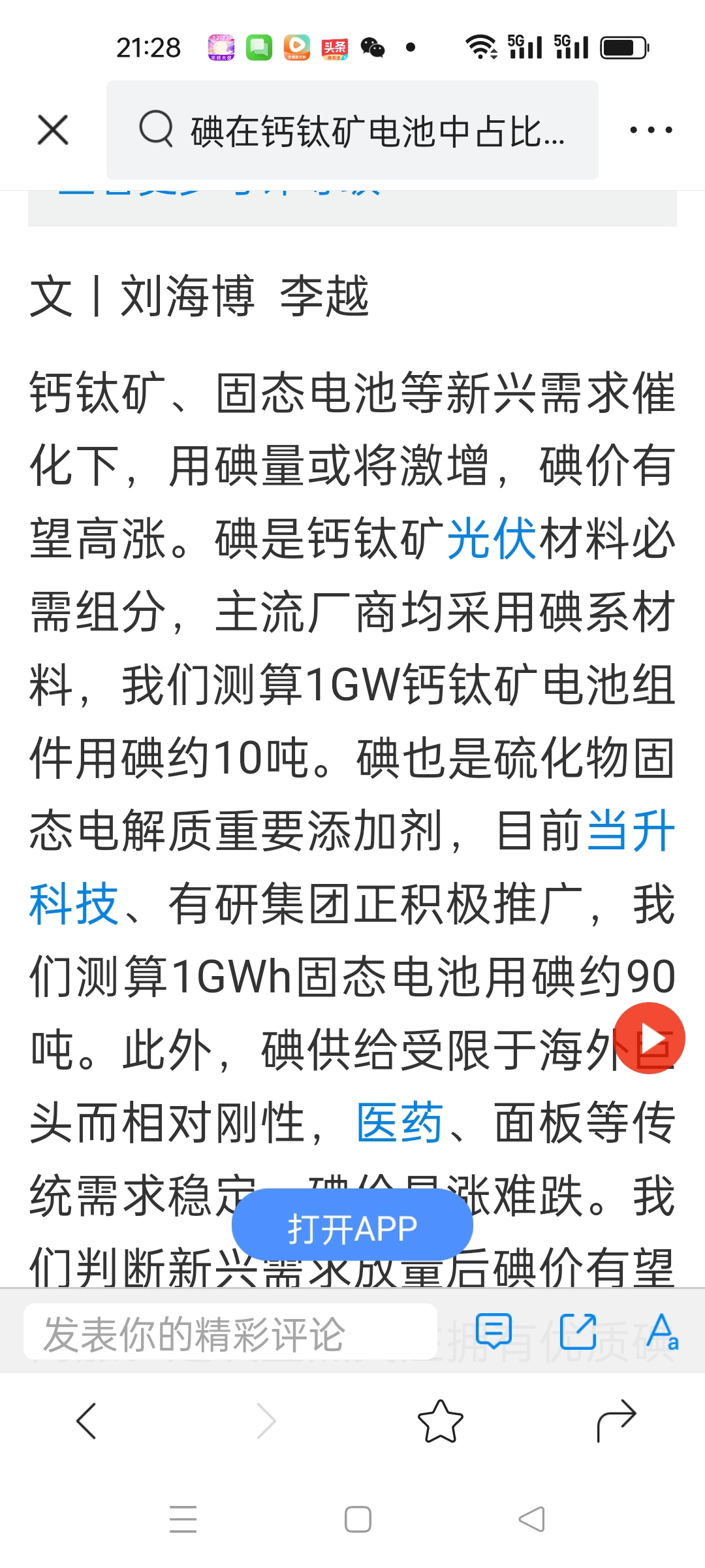 $博苑股份(SZ301617)$ 固态电池不一定要选择碘,但钙钛矿电池却是刚需,现钙钛矿电池已不是炒作,随着新技术的突破,量产势在必然,博苑新增的4000吨产能,刚好能契合钙钛矿电池的量产,前景非常清晰