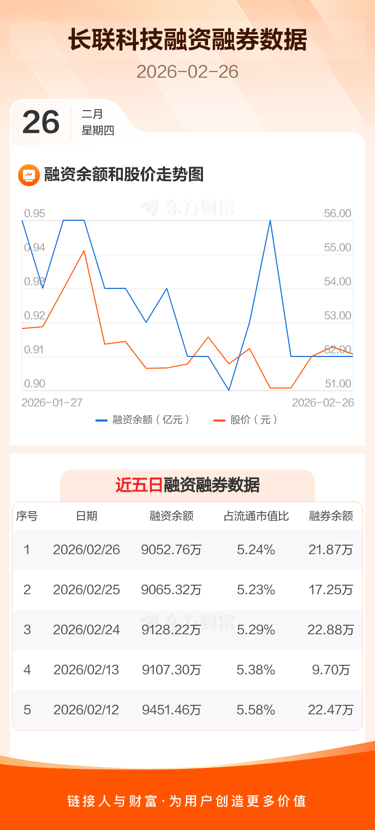 交易所最新数据显示,长联科技于2026年2月26日获融资买入285.18万元,融资偿还297.73万元,当日融资净偿还12.56万元。目前,该股融资余额9052.76万,占流通市值比例为5.24%。
