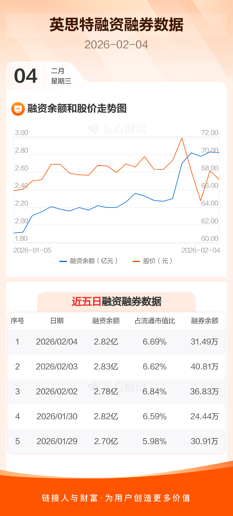 交易所最新数据显示,英思特于2026年2月4日获融资买入1491.42万元,融资偿还1606.61万元,当日融资净偿还115.19万元。目前,该股融资余额2.82亿,占流通市值比例为6.69%。