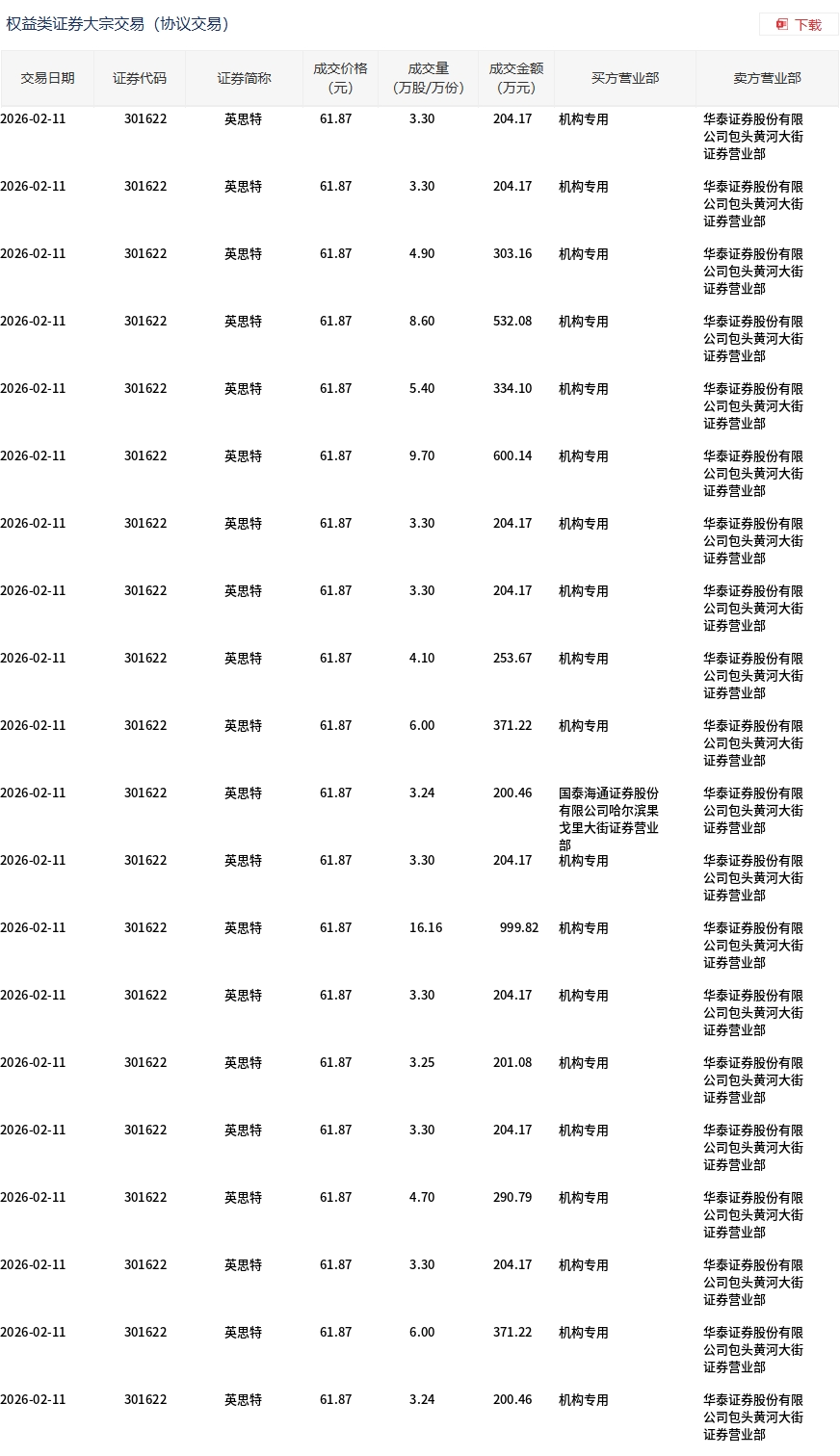 英思特今日大宗交易折价成交101.69万股,成交额6291.56万元