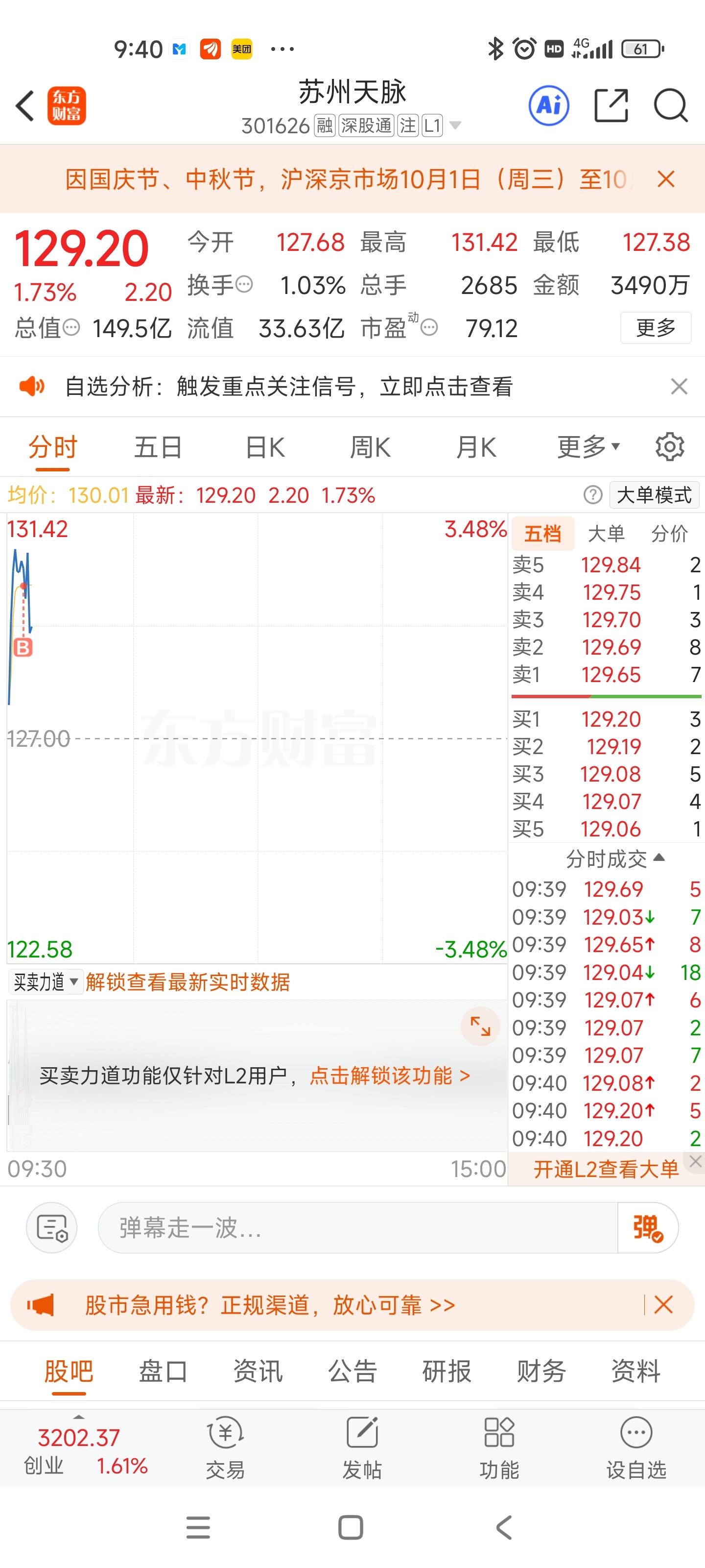 $苏州天脉(SZ301626)$ 高吸低抛,周五128.5抛了,今天131元又买入。难道今天又错了