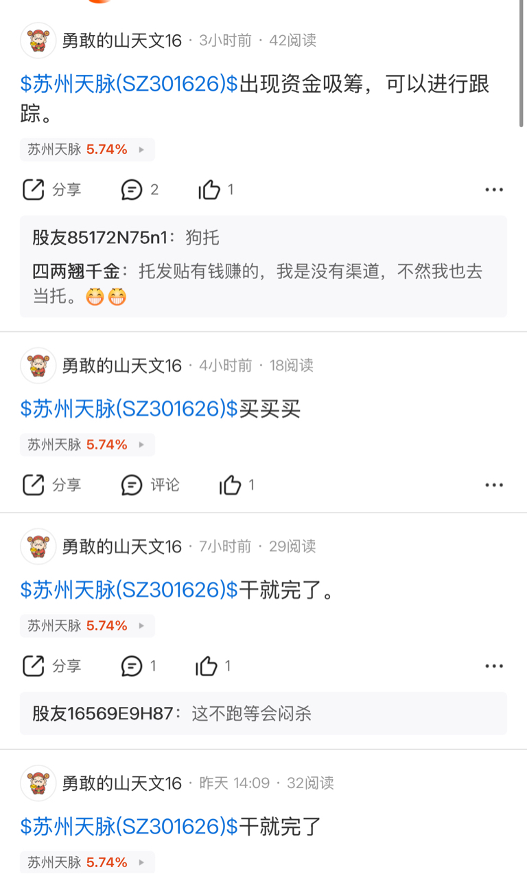 $苏州天脉(SZ301626)$ 当一个帖子出现这种托开始疯狂吹票,那说明马上就要进入出货下跌行情了,大家拭目以待,哈哈