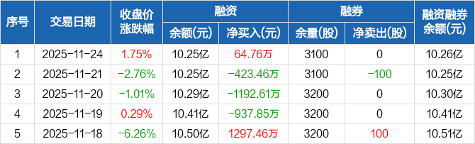 苏州天脉:融资净买入64.76万元,融资余额10.25亿元(11-24)