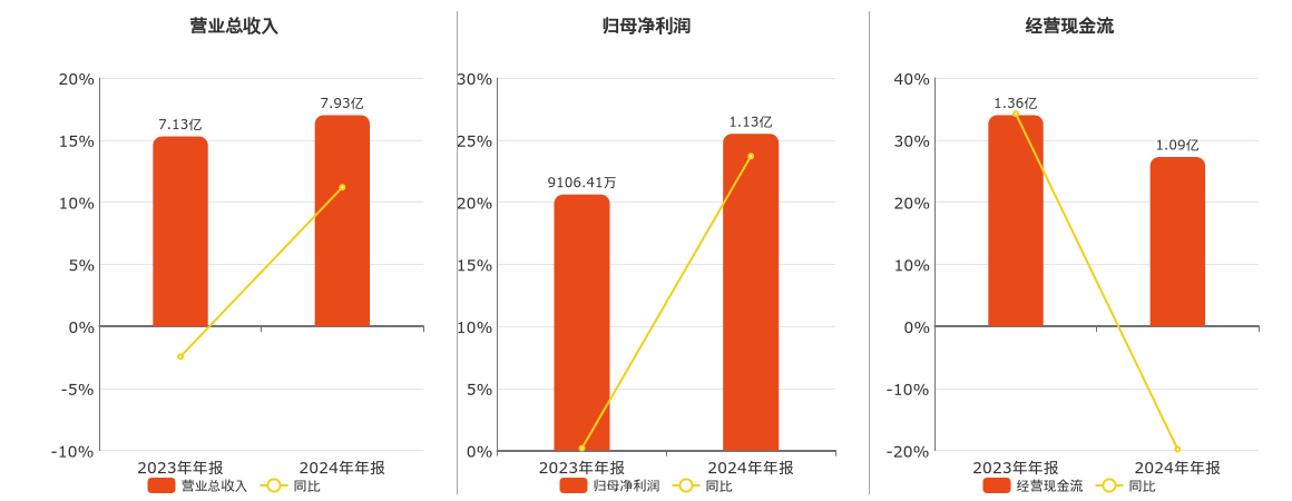 公司营业总收入为7.93亿元,在已披露的同业公司中排名第27。归母净利润为1.13亿元,在已披露的同业公司中排名第22。经营活动现金净流入为1.09亿元,在已披露的同业公司中排名第25,较去年同报告期经营活动现金净流入减少2685.09万元,同比较去年同期下降19.80%。