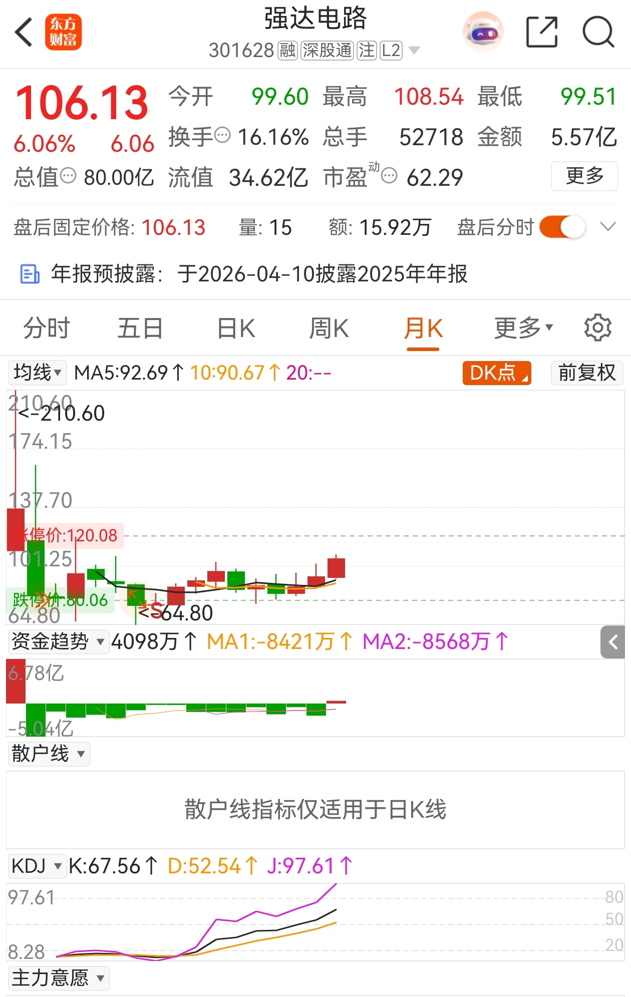$强达电路(SZ301628)$ 看月线,这个股还处于绝对的底部,最高价210元,目前还对折价^