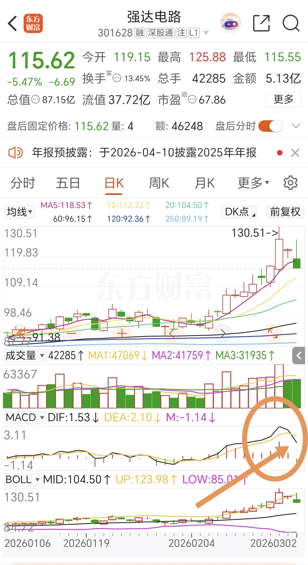 连续跟踪第5天。地缘政治冲突,导致市场大部分资金被虹吸到战争题材,没有先手也不敢追高,场外资金也不敢贸然进场,加之3月份和4月份年报集中披露,以及3月份会议还没定调,盘面走得有点太乱。加上昨天出现0轴上方死叉,股价偏离布林线上轨,短期预判处于下跌趋势。今早开盘还给了足够多的时间跑路。感谢持续关注的股友,咱们重新出发。