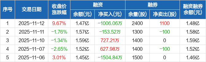 壹连科技:融资净偿还1006.06万元,融资余额1.47亿元(11-12)