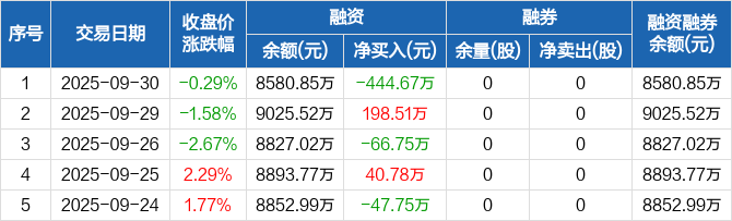港迪技术:融资净偿还444.67万元,融资余额8580.85万元(09-30)