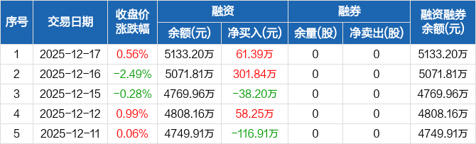 泽润新能:融资净买入61.39万元,融资余额5133.2万元(12-17)