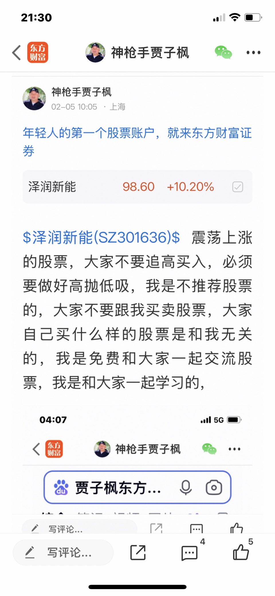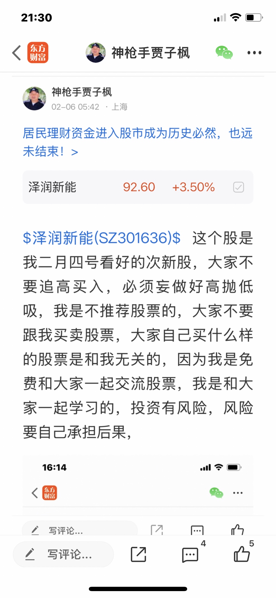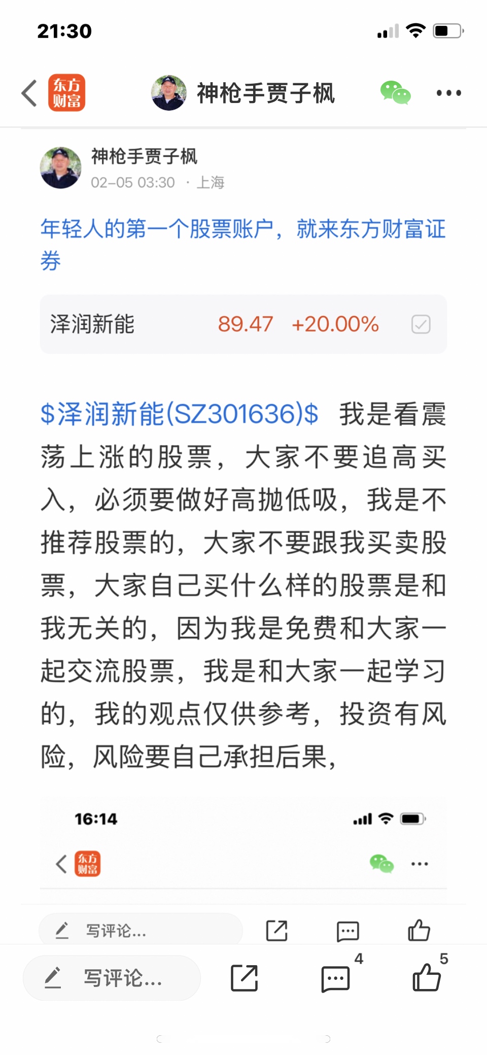 $泽润新能(SZ301636)$ 这个股我是二月四号发表文章看涨的股票,大家不要追高买入,必须要做好高抛低吸,我是不推荐股票的,大家不要跟我买卖股票,大家自己买什么样的股票是和我无关的,因为我是免费和大家一起交流股票,我是和大家一起学习的,我的观点仅供参考,不构成任何投资建议,投资有风险,风险要自己承担后果,