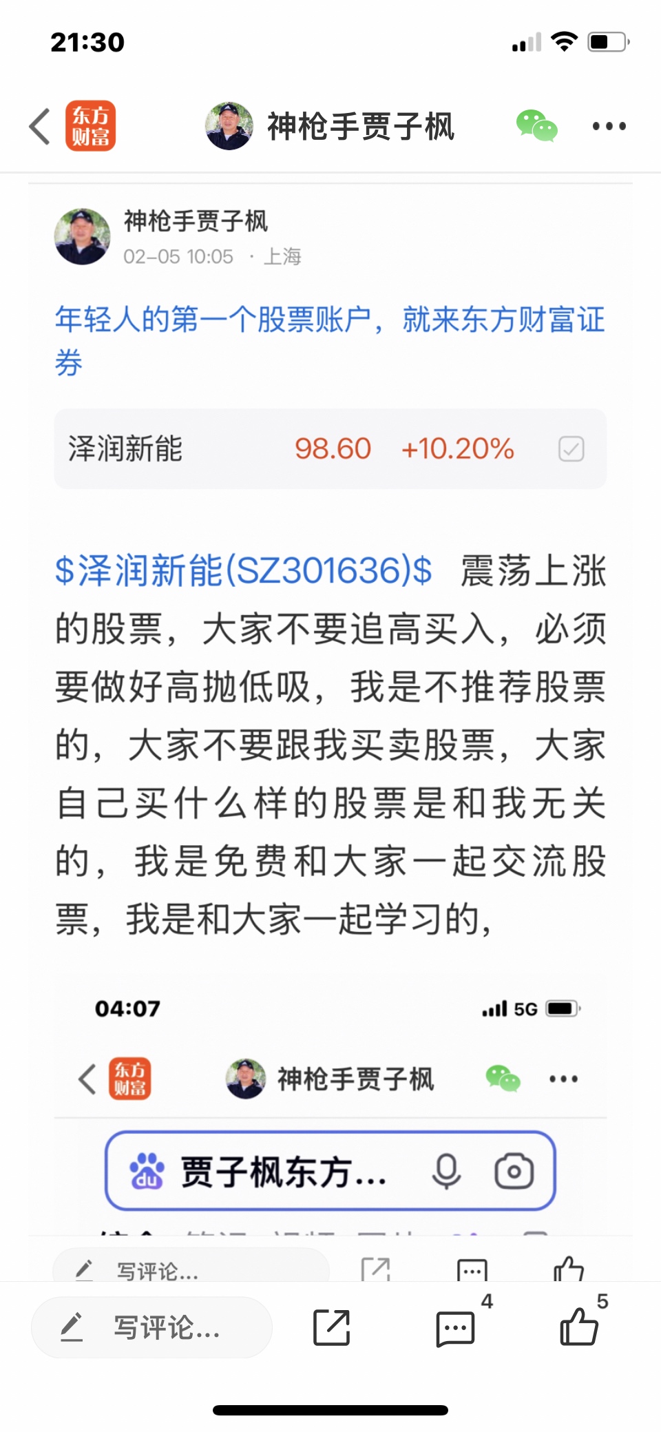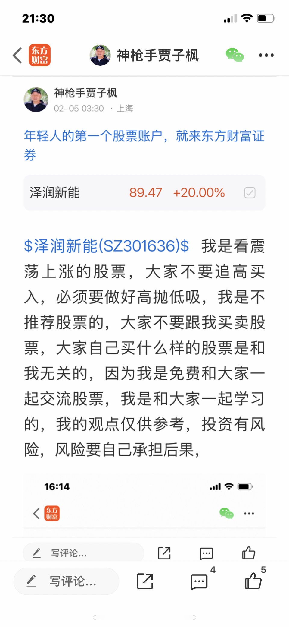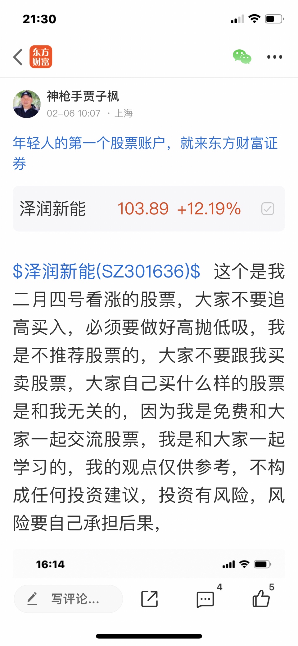 $泽润新能(SZ301636)$ 这个股是我二月四号发表文章看涨的股票,大家不要追高买入,必须要做好高抛低吸,我是不推荐股票的,大家不要跟我买卖股票,大家自己买什么样的股票是和我无关的,因为我是免费和大家一起交流股票,我是和大家一起学习的,我的观点仅供参考,投资有风险,风险要自己承担后果,