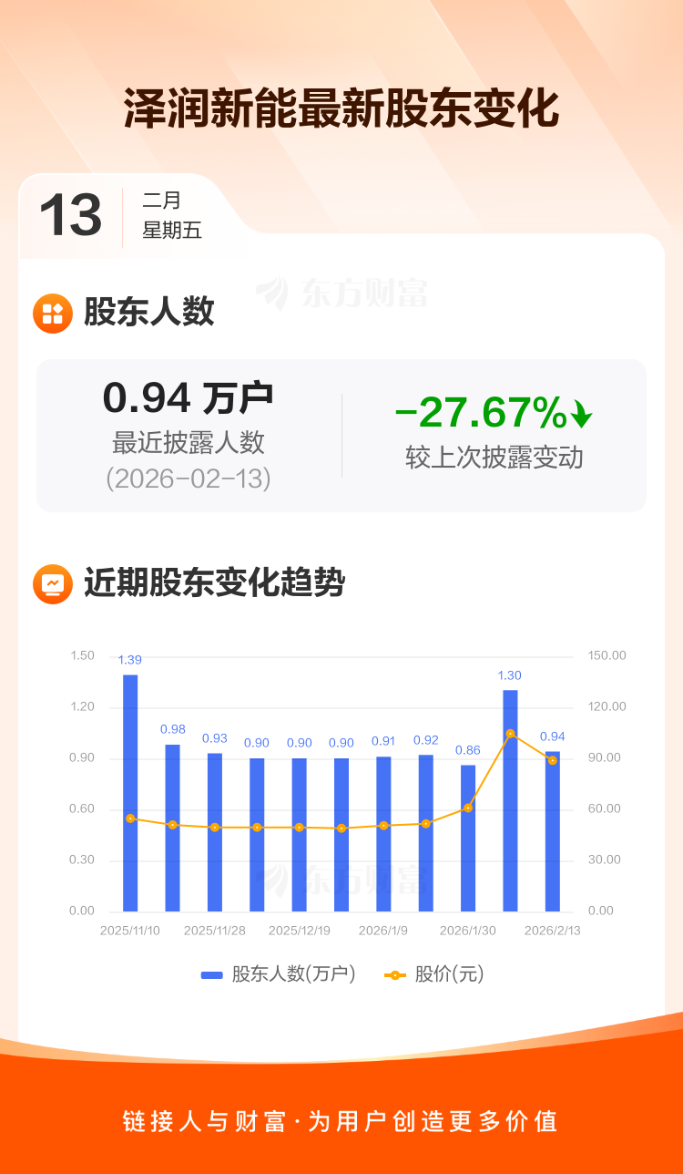 泽润新能最新披露数据显示,截至2月13日公司股东户数为9413户,较上期(2026年2月10日)减少3601户,降幅为27.67%。户均持有流通股数量由上期的1226股上升至1696股,户均持股金额由上期的12.83万元增加至15.05万元。