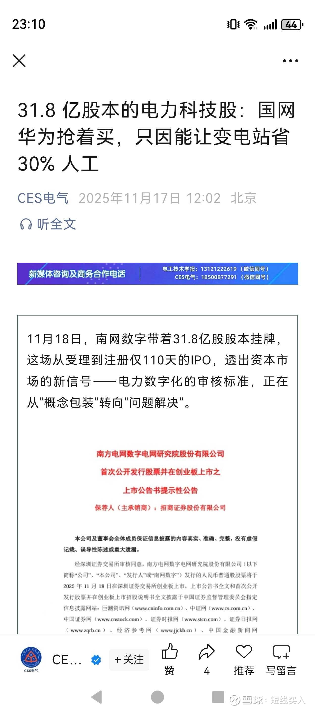 $C南网数(SZ301638)$ 电力科技股:国网华为抢着买,只因能让变电站省 30% 人工。。降低线损0.7%,相当于每年省38亿度电,南网数字的过会靠的是硬碰硬的技术:伏羲芯片国产率85%,让变电站主控单元成本降60%;边缘计算终端让乡村故障响应快4倍。