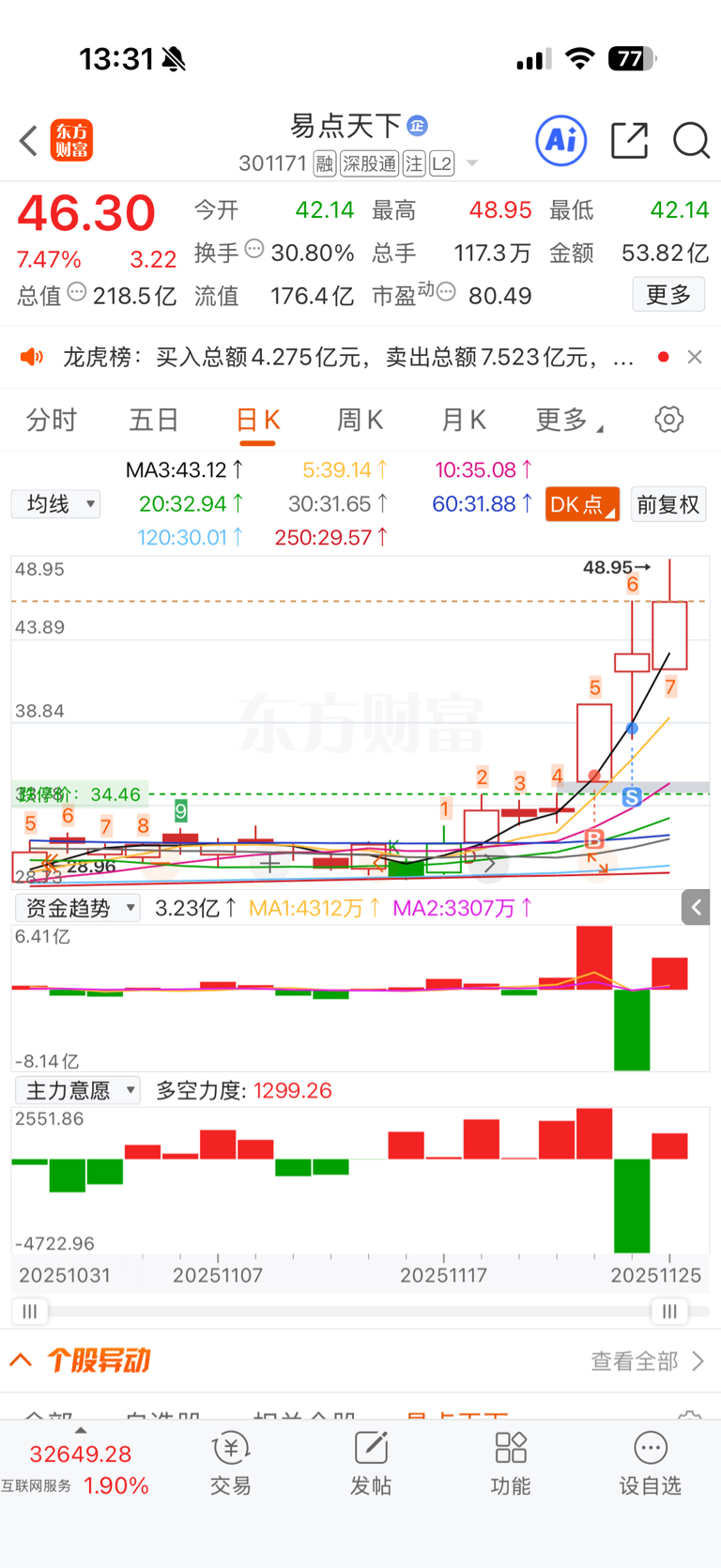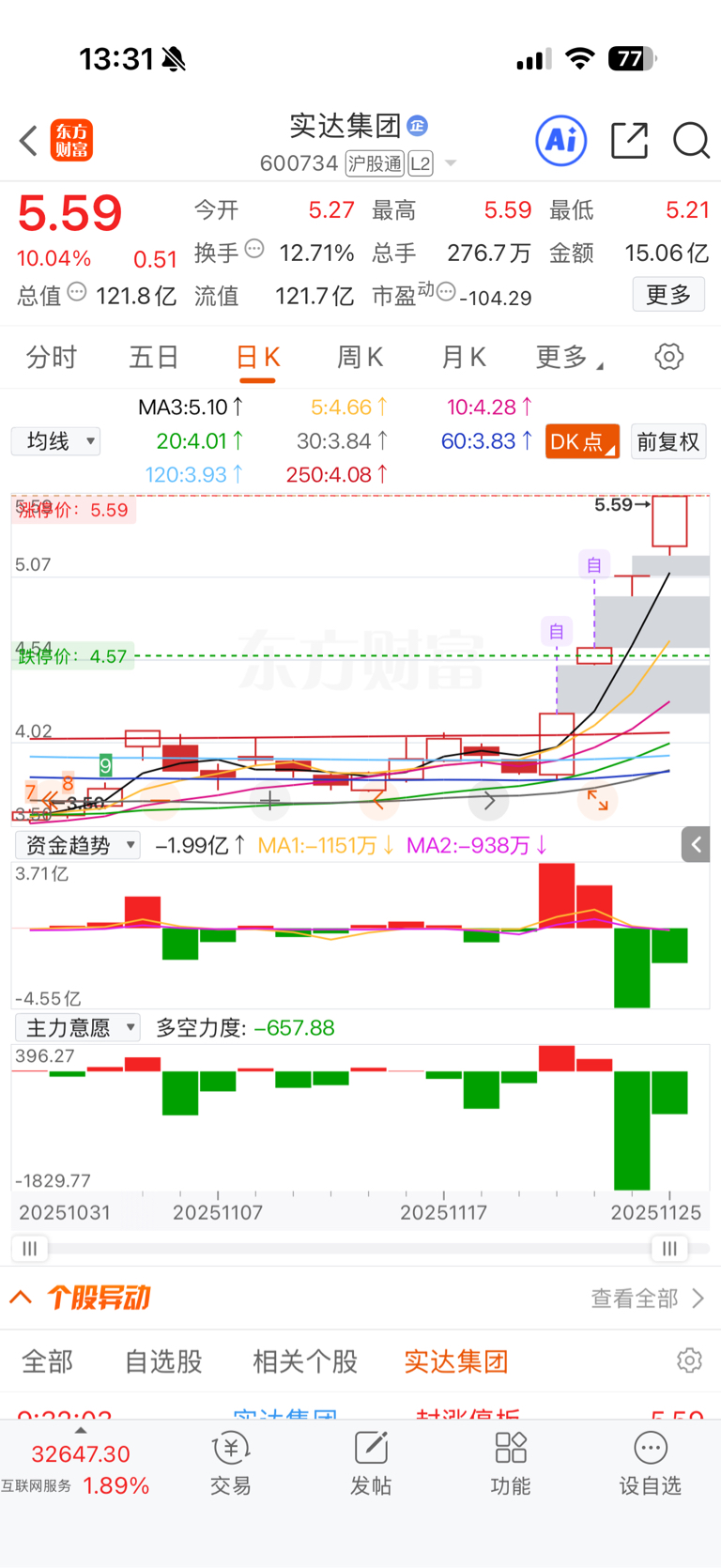 上周五选的实达集团和易点天下,20厘米的当天舒服,周一开盘被洗出去了大涨,今天又