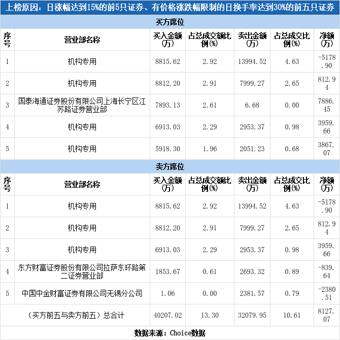 龙虎榜数据显示,今日共7个机构席位出现在龙虎榜单上,分别位列买一、买二、买四、买五、卖一、卖二、卖三,合计净买入3460.77万元,占龙虎榜净买额的42.58%。除此之外还有德科立、航天发展、盛新锂能等38只个股榜单上出现了机构的身影,其中17家呈现机构净买入,获净买入最多的是航天发展,净买额为1.47亿元;21家呈现机构净卖出,其中遭净卖出最高的为德科立,净卖额为1.50亿元。