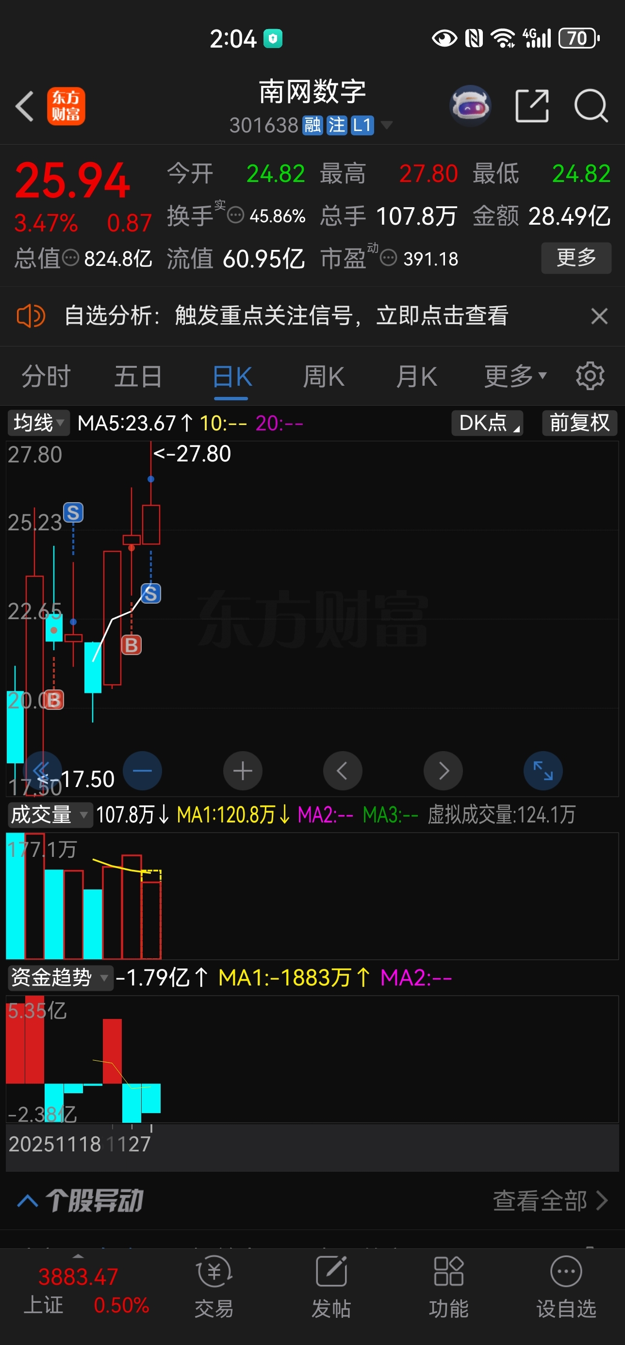 $南网数字(SZ301638)$ 两进两出,前面平仓出躲过大跌,也错过20Cm大涨,昨天二次上车,早上吃点小肉走人。不知道明天会不会又进入调整?