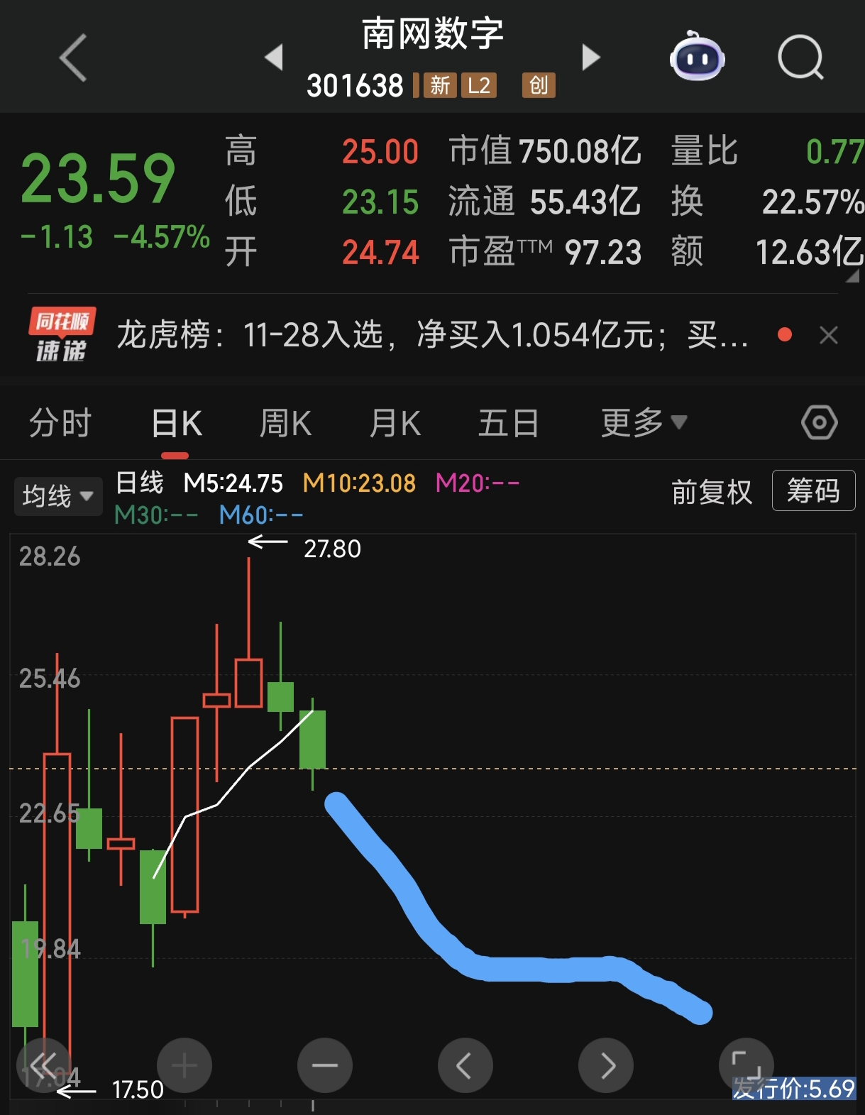 $南网数字(SZ301638)$ 感觉27.80就是顶了,会慢慢阴跌回17.50附近,期间22元、20元、18元可能会有反弹,但下跌趋势不会改变。