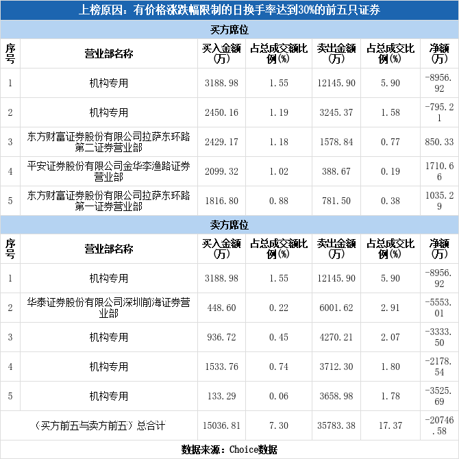 龙虎榜数据显示,今日共6个机构席位出现在龙虎榜单上,分别位列买一、买二、卖一、卖三、卖四、卖五,合计净卖出1.88亿元,占龙虎榜净卖额的90.57%,是今日龙虎榜中遭机构净卖出最多的个股。除此之外还有同庆楼、平潭发展、航天动力等30只个股榜单上出现了机构的身影,其中10家呈现机构净买入,获净买入最多的是四方达,净买额为5607.28万元;20家呈现机构净卖出,其中遭净卖出最高的为同庆楼,净卖额为1.70亿元。