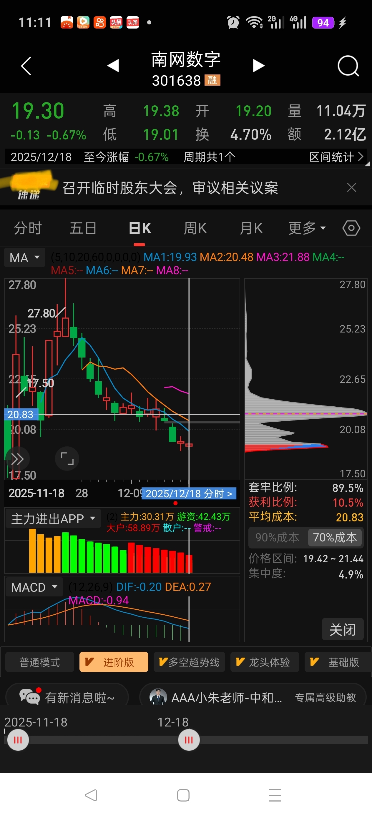 $南网数字(SZ301638)$ 明天应该会涨,因为主力成本与平均成本,双线合一了。