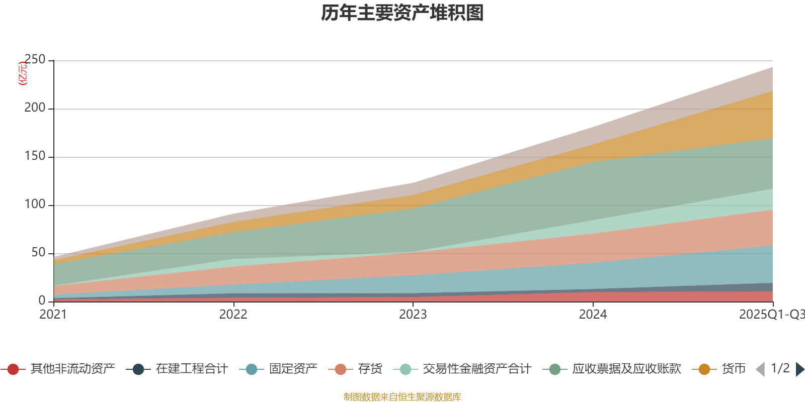 资产重大变化方面,截至2025年三季度末,公司应收票据及应收账款较上年末减少12.83%,占公司总资产比重下降11.71个百分点;货币资金较上年末增加167.9%,占公司总资产比重上升10.03个百分点;在建工程合计较上年末增加177.38%,占公司总资产比重上升1.86个百分点;存货较上年末增加22.43%,占公司总资产比重下降1.49个百分点。