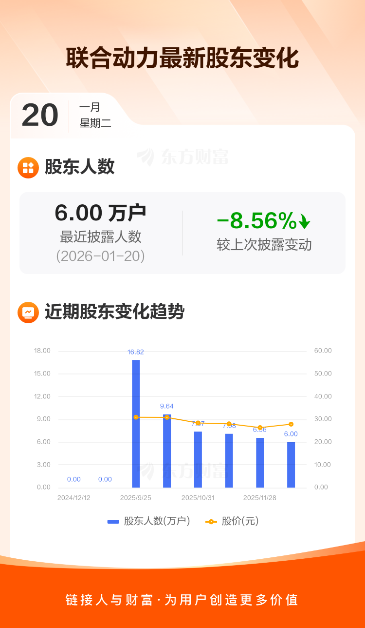 联合动力:截至1月20日最新股东户数6.00万户,较上期减少8.56%