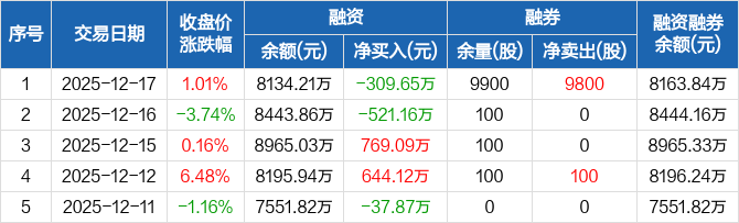 首航新能:融资净偿还309.65万元,融资余额8134.21万元(12-17)