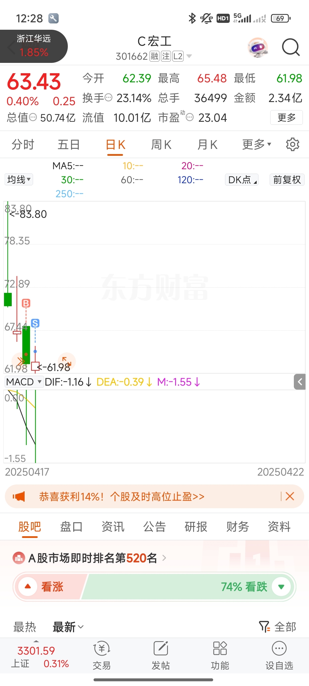 $C宏工(SZ301662)$ 赚300块清仓了,不陪你们做梦了